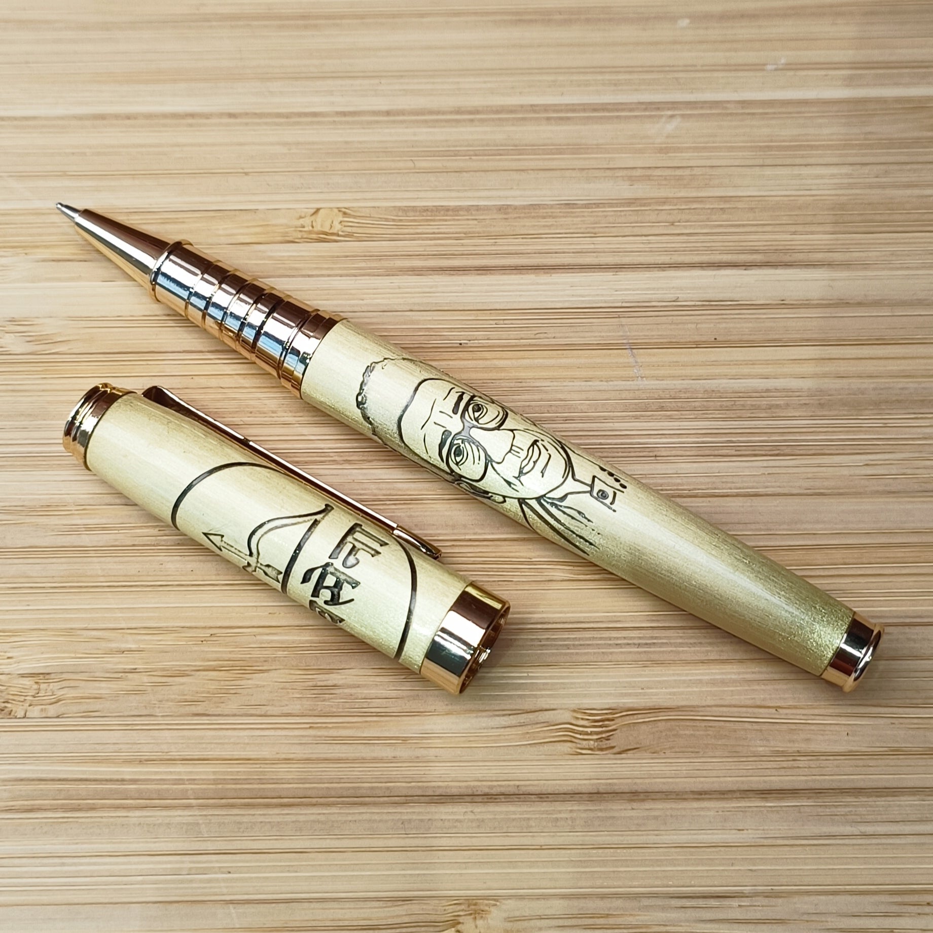 ### Golden Brass Pen with Bow and Arrow Emblem and Balasaheb Thackeray's Portrait
