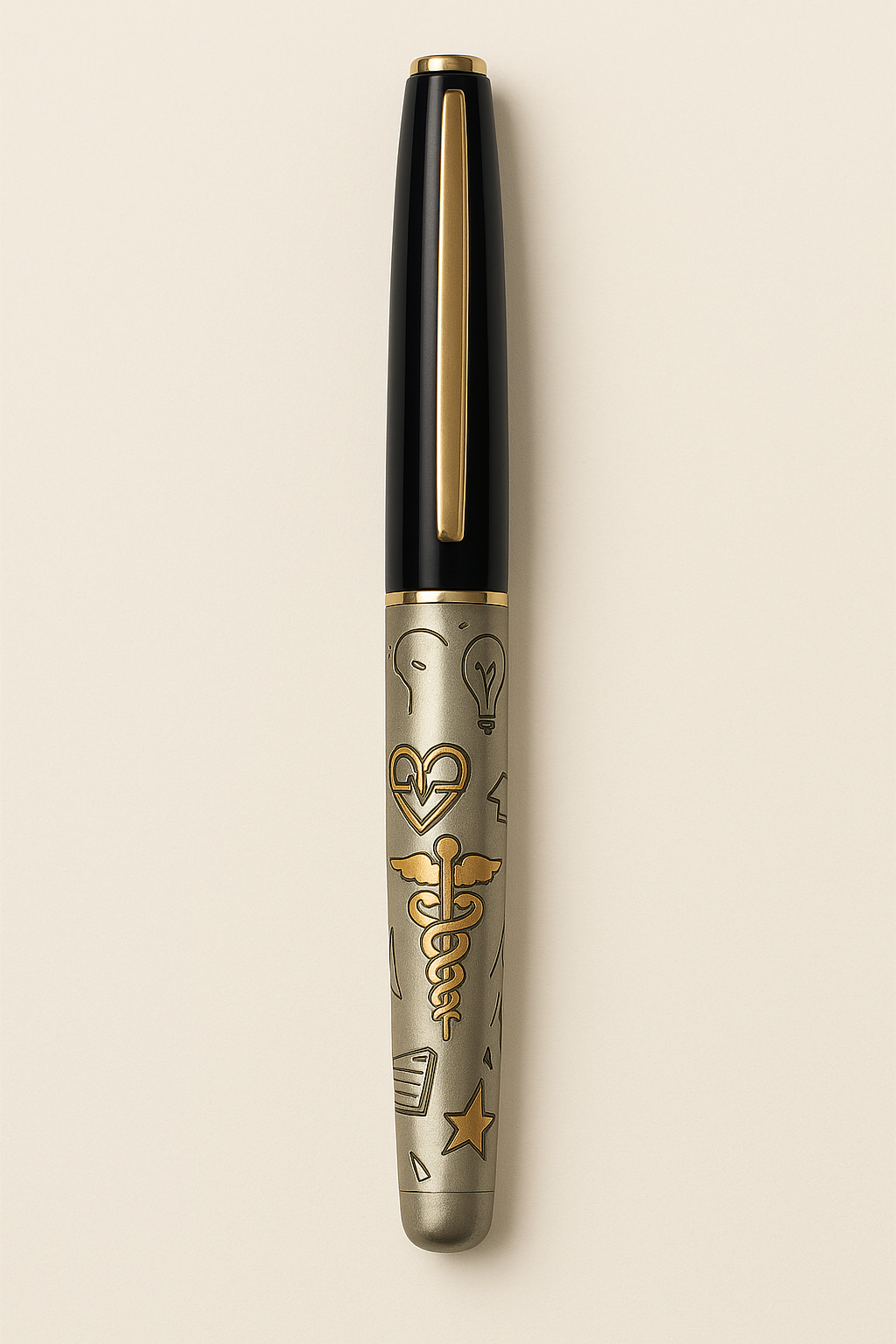 This exquisite pen features intricately engraved symbols of the medical world — including the stethoscope, IV drip, heartbeat, first aid kit, DNA strand, caduceus, and more — capturing the essence of a doctor's daily life. Every icon tells a story of compassion, precision, and dedication.