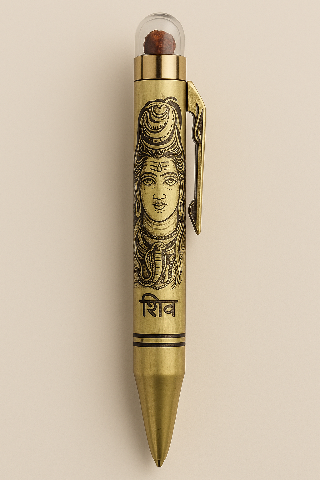 Crafted in a premium golden finish, this pen features an intricately engraved image of Lord Shiva, a majestic Trishul, and a sacred Rudraksha encased at the top – symbolizing divine blessings and protection.